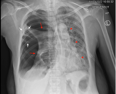 Figure 4: Single view chest X-ray showing Right pneumothorax with collapsed right lung; Red arrows, and left mediastinal shift; red arrow heads. Persistent Cavitary lesion with tethering of right lung tissue to chest wall; white arrows.
