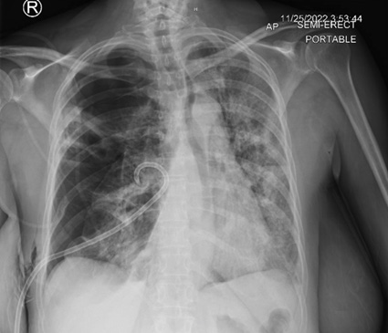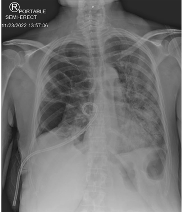 Figure 5: Single view chest X-ray showing post non-surgical chest tube placement with slight improvement of right lung atelectasis.