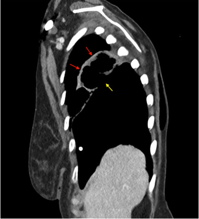 Figure 7: coronal view of Chest CT showing disruption of the inferior border of the cavitary lesion and confluence with the cavitary space with the pleural space. Red arrows; Cavitary lesion, Yellow arrow; disrupted inferior border of the cavitary lesion.