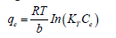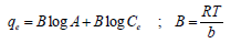 Where A and B are Temkin isotherm constant (equilibrium binding constant) and Temkin constant attached to heat of adsorption (J/mol). The parameter, b (J/mol) is a constant related to heat energy available in sorption, R is gas constant (8.314 J/molK) and T is the absolute temperature in Kelvin.