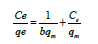Where qe and qmax are solid phase adsorbate concentration at equilibrium (mgg-1) and maximum adsorption capacity (mgg-1), Ce is the adsorbate concentration at equilibrium (mg/L) and KL is the Langmuir constant (L/mg). Langmuir isotherm is a model that is often employed for metal ion uptake during adsorption, it suggests that a certain adsorbent possesses a definite number of active pores with similar energy level for monolayer coverage [13]. The original Langmuir equation can be expressed in a linear form as follows: