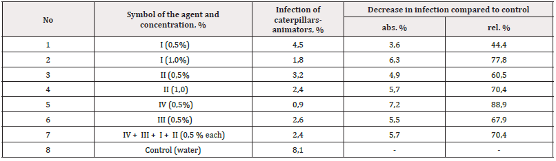 Presented on the (Table 2) data indicate that after the treatment of nosematosis grena with solutions of the sum of sesquiterpene lactones, the infection of hatched caterpillars with nosematosis decreased in all variants. Under a microscope, each caterpillar that emerged from the treated grena was individually examined. When treated with solutions of extracts, grenae infected with nosematosis led to a decrease in the infection of hatched caterpillars by 3.6-7.2% absolute, or by 44.4-88.9% relative, compared with the control. High protivonozematoses action showed funds with the code names IV at a concentration of 0.5%, I at a concentration of 1.0% and II at a concentration of 1.0%.
