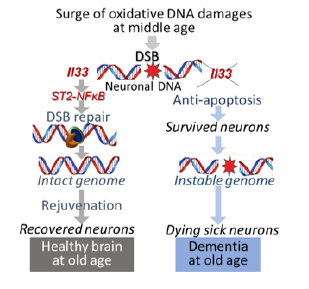 Recent studies including ours have given the following potential scenario for development of senile or age-related dementias by deficiency of IL33-NFκB axis in neurons (Fig. 2). In normal individuals, immediate repair of DSBs during oxidative surge ensures normal rejuvenation process for stressed neurons toward a full recovery. On the other hand, accumulation of unrepaired DSBs due to IL33-NFκB deficiency disrupts some or all subsequent rejuvenation mechanisms. Massive DSBs should otherwise have induced apoptosis in any other types of cells, but not in those neurons [17] (Figure 2).