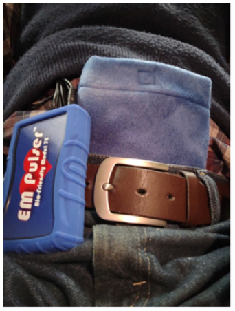 Figure 3: EM Pulser wired to Pulse Pad attachment partially inserted into trousers for abdominal relief after surgery, as alternative to pain killers.