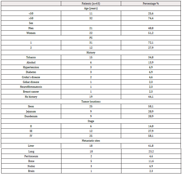 Table 1: Characteristics of patients followed for malignant tumors of the small intestine, medical oncology department, Hassan II University Hospital, Fez, Morocco, January 2016-January 2020.