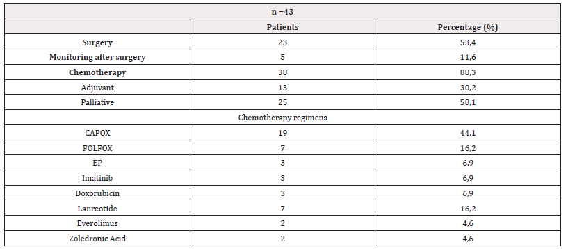 Table 2: Therapeutic modalities of patients followed for malignant tumors of the small intestine, medical oncology department, Hassan II University Hospital, Fez, Morocco, January 2016-January 2020.