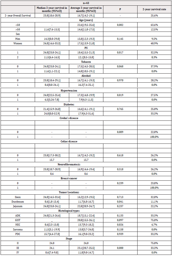 Results: We included 43 patients. The average age was 57 years, with a female predominance. A history of smoking was common to 34.8% of patients. The ileal localisation was the most found (58.1%). Adenocarcinoma (ADK) was the most common histological type (42%). The disease was diagnosed at an advanced stage in 58.1% of cases. Optimal surgery was performed in more than half of patients (53.4%). Chemotherapy was administered to 88.3% of patients. The median OS at 2 years was 23.8 months (95% CI: 18.6-28.9), representing a survival rate estimated at 25.6%. We observed a significantly short survival in patients over 50 years old (11.6 months; 95% CI: 7.6-15.5; p=0.002), with a performance status (PS) greater than 1(11.5 months; 95% CI: 6.4-16.5; p=0.017), hypertensive patients (6.5 months; 95% CI: 5.26-7.8; p=0.019), in the case of duodenal location of the primary tumor (8.6 months; 95% CI: 1.8-15.4; p=0.041), for neuroendocrine carcinomas (NEC) (8.6 months; 95% CI:2.3-15.0; p= 0.026) and in stages IV (8.6 months; 95% CI: 7.4-9.8; p=0.000). For the other factors studied: male sex, history of smoking, alcoholism, celiac disease and neurofibromatosis, , we found a numerical drop in survival but without statistically significant benefit. While there was no impact on survival in diabetic patients, with a history of Crohn’s disease and breast cancer. However, in multivariate analysis, the factors that were found to be prognostic for survival were advanced age, impaired PS, duodenal location of the primary tumor, the metastatic stage of the disease compared to localized stages and sarcomatous histology unlike ADK which had better survival.