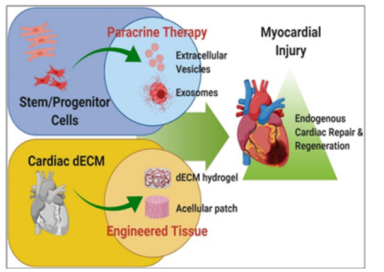 2. Tissue engineering approaches combining cells with biomaterials to design in vitro cardiac patches or injectable scaffolds for transplantation into the infarcted heart area.