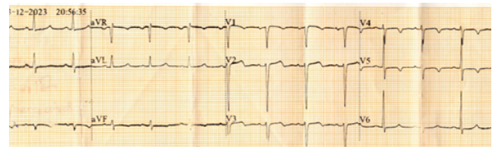 Figure 4: Event ECG showing ST depression at II, III, AVF, V4-6, sinus tachycardia, T inversion at I & AVL, tall T at V2-3.