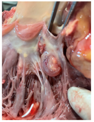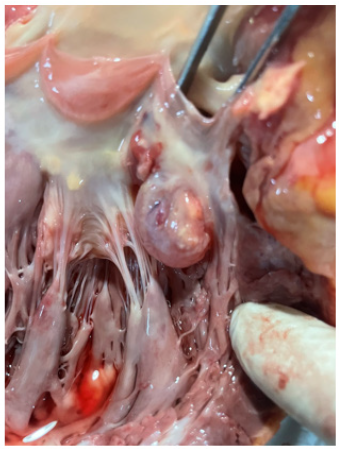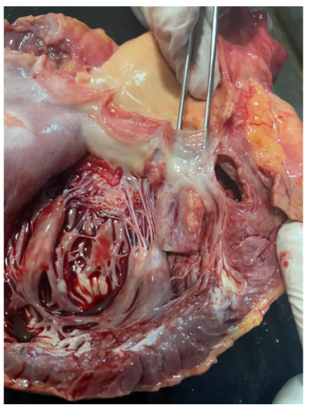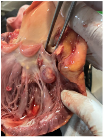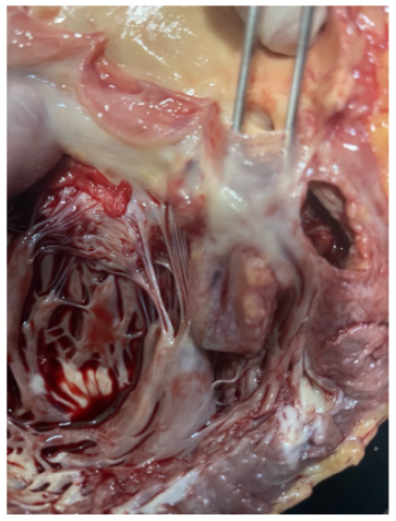 Figure 9b: Post-mortem examination of cut section of left ventricle and the forceps pointing the aneurysm of Sinus of Valsalva attached to posterior cusp of aortic valve. The myocardium of left ventricular is hyperemic.