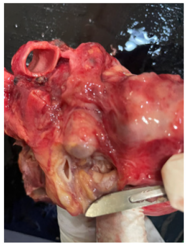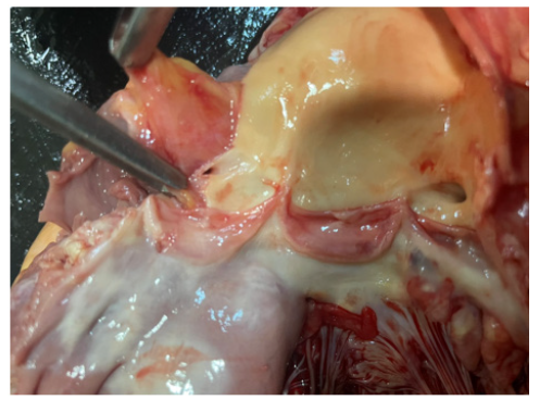 Figure 8: Post-mortem examination of cut section showing intact both right and left coronary ostia just above 3 cusps of aortic valve.