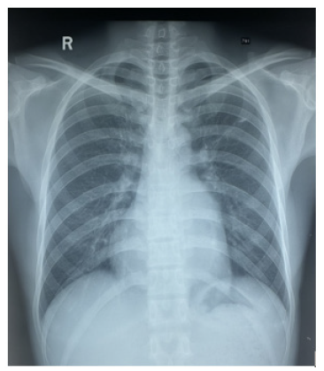 There were no features of heart failure or infective endocarditis. Figure 1 shows initial ECG on admission. ECG revealed left axis deviation with left ventricular hypertrophy. Figure 2 demonstrates Chest Xray. Heart size was upper limit of normal and lung fields were clear.
