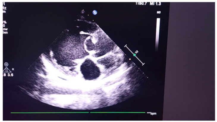 Figure 3a: Echocardiogram demonstrating a ring-shaped mass attached to aortic valve and its convexity towards left ventricle.
