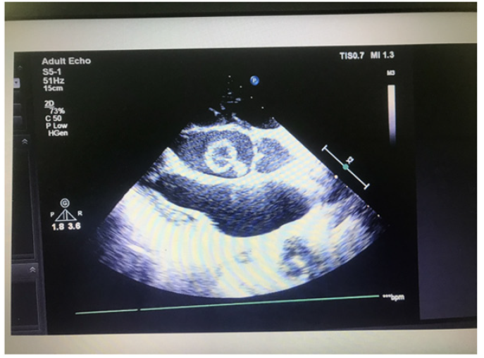 Figure 3b: Echocardiogram demonstrating a ring-shaped mass attached to aortic valve and its convexity towards left ventricle.