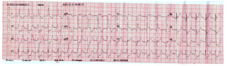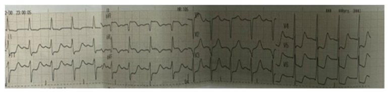 Figure 5: ECG after thrombolysis showing left bundle branch block, ST depression at II, III, AVF, V4-6, sinus tachycardia, Q/S inV1-3, T inversion at I & AVL.