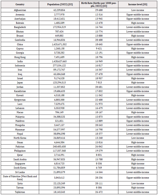 The impact of RSV infections on the health of children outside medical settings as well as on the burden to hospitals and public health in general is still underestimated, as there is hardly any systematic testing for the pathogen in daily medical practice, resulting in relevant data gaps. While there is a huge number of studies on the epidemiology of RSV from the European Union and North America, there is a lack of such studies in Asian countries. Here we aimed to identify such studies from Asian countries, investigate whether there is any lack of data in these target countries, and provide some suggestions to fill the data gap and therefore, to improve public health. A list of Asian countries, their population, and economy are shown in Table 1.