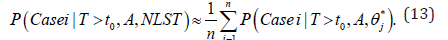 The unknown parameters were θ= (µ, σ2, α, λ) in the above model, and we have obtained 1500 Bayesian posterior samples of θ using a likelihood function and Markov Chain Monte Carlo simulations. For more details, see [6]. The posterior predictive probability of each case can be estimated using the NLST data by the following: