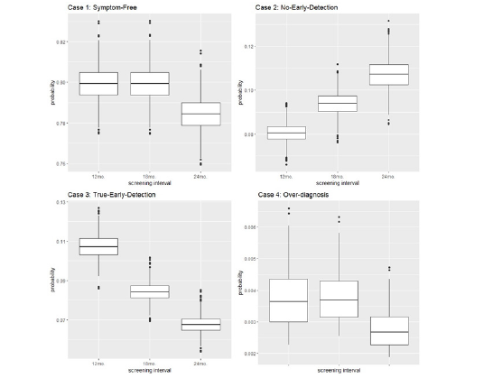 Boxplots of the results for the probabilities of each case when t0=60 for male and female are provided in Figures 2 and 3. In Figure 2, the probability of symptom-free-life (and the probability of overdiagnosis) are almost the same for the 12-month and the 18-month screening intervals, and it is slightly lower for the 24-month intervals. On the other hand, the probability of no-early detection increases monotonically with the screening time interval, while the probability of true-early-detection decreases monotonically with the length of the screening time interval. This pattern is the same for all the ages of screening for both males and females.