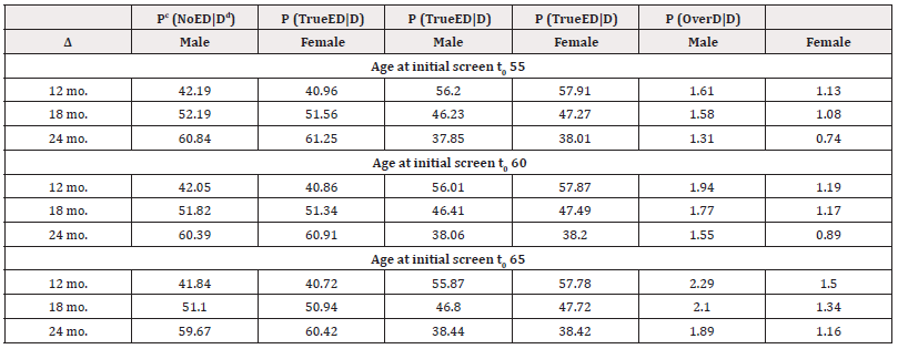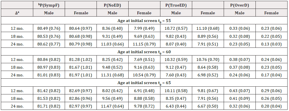 The estimated probability of true-early-detection for initial screening ages 55, 60, and 65 is 10.72%, 10.32%, and 10.11% for males, and 11.10%, 10.76%, and 9.81% for females, respectively, when annual screening is conducted. It decreases with longer screening time intervals and as initial screening age increases. It seems that males have a slightly lower propensity for true-early-detection compared to females. The probability of overdiagnosis is very low across all three age groups. Specifically, for the 12- month screening interval and initial screening ages of 55, 60, and 65, the probabilities of overdiagnosis are approximately 0.33%, 0.38%, and 0.43% for males, and 0.23%, 0.24%, and 0.29% for females, respectively. It is worth noting that these probabilities decrease as the screening interval (∆) increases. While the probability of overdiagnosis is slightly higher when the initial screening age is 65, there is minimal difference observed for the other age groups. The results presented in Table 1 demonstrate that males exhibit a slightly higher susceptibility to overdiagnosis compared to females.