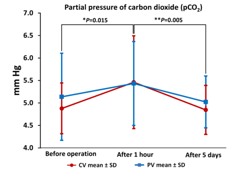Figure 10: Carbon dioxide pressure (pCO2) between CV and PV groups in three measured time points. The preoperative pCO2 mean value was significantly lower than the mean value one hour after the operation (post-hoc HSD *P=0.015) and the mean value of pCO2 one hour after the operation was significantly higher than after 5 days (post-hoc HSD **P=0.005). SD, standard deviation; pCO2, partial pressure of carbon dioxide.