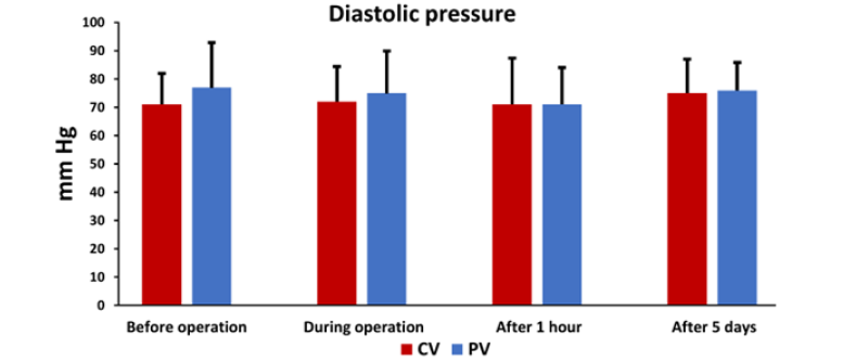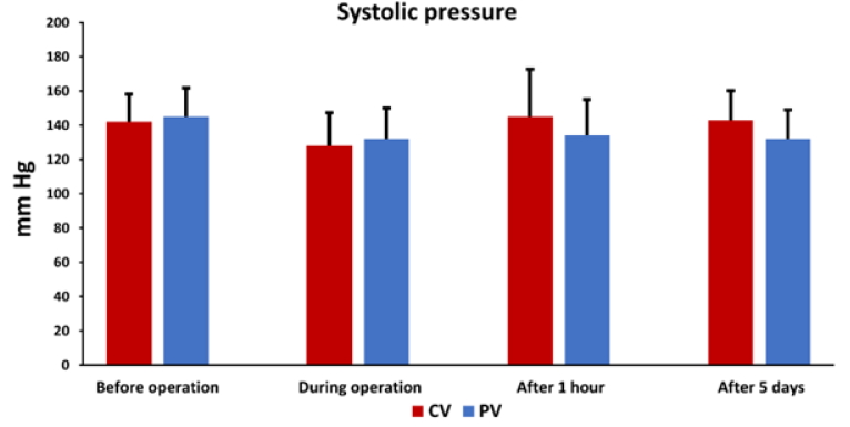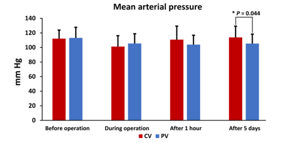 1) Compared to the CV group, the intraoperative Mean Arterial Pressure (MAP) drop was non-significantly smaller in the PV group and also significantly lower in the PV group five days after the operation;