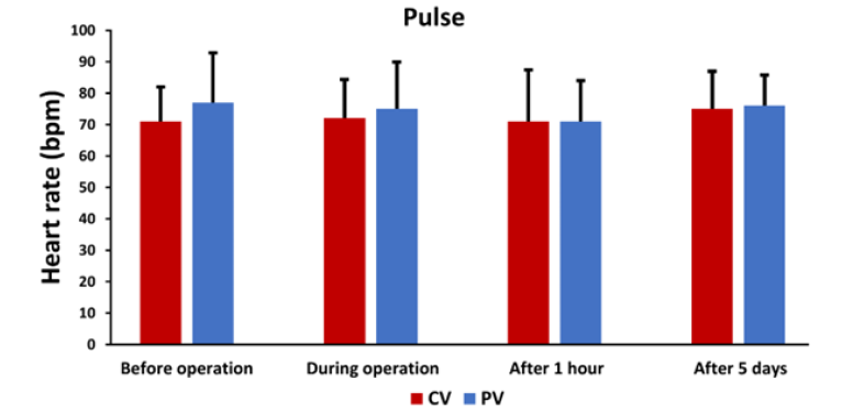 We have also monitored the pulse of all patients. Although the effect of time had a significant overall effect on the mean pulse values in four time points (F=4.659, df=44, **P=0.007), there were no significant differences between the CV and PV groups at any given time point (F=0.088, df=46, P=0.768; Figure 6).