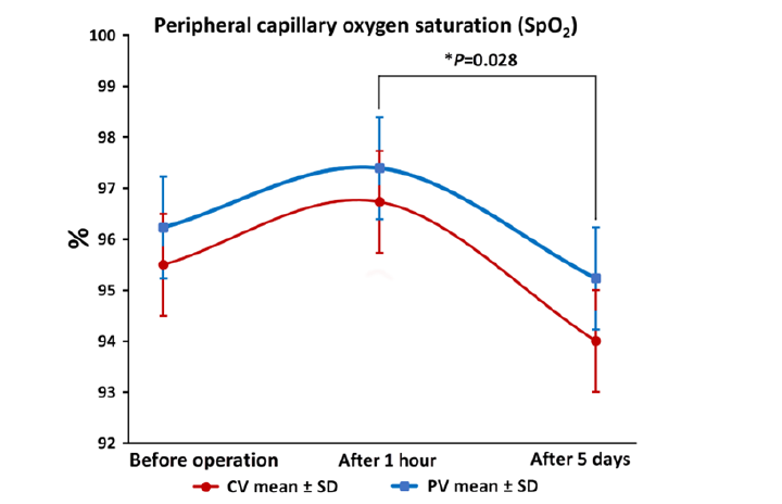 2) Peripheral capillary oxygen saturation (SpO2) was non-significantly higher in all time points in the PV group, and, compared to the time point one hour after the operation, overall significantly lower after 5 days;