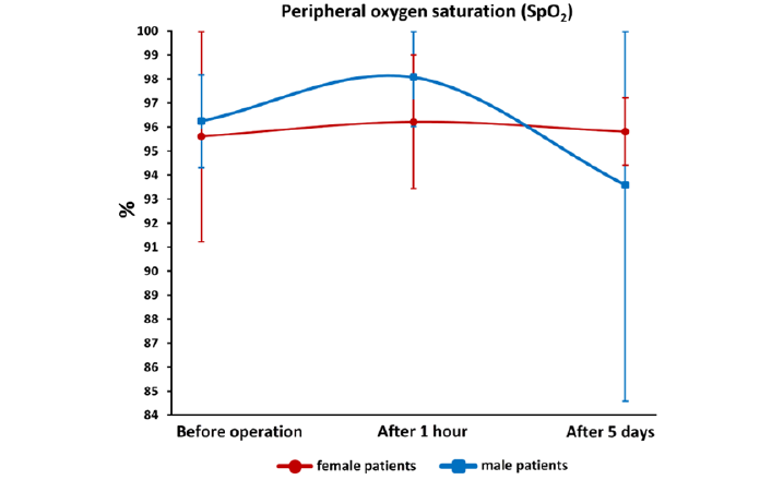 Figure 9: Peripheral (capillary) oxygen saturation (SpO2) is significantly higher in male patients in comparison to female patients (*P=0.011). The graph shows mean values ± SD. It can be seen from the graph that SpO2 is slightly higher in men before the operation and after 1 hour, while after 5 days it is significantly lower than in women. SpO2, peripheral capillary oxygen saturation.