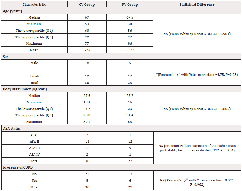 The study included 24 male and 29 female subjects. Eighteen male and 12 female patients were selected by randomization for the conventional ventilation procedure (the CV group). Protective Ventilation (PV) was assigned to six male and seventeen female patients undergoing general anaesthesia. The proportion of male patients in the CV group was significantly higher compared to the PV group (Pearson's =6.04, df=1, P=0.014). All patients gave informed consent for participation in this study. The demographic and anthropometric characteristics of patients according to the group assigned, as well as their ASA status and comorbidities (COPD), are given in Table 1.