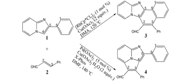 Scheme 1: Regioselective oxidative annulation of 2-arylimidazo[1,2-a] pyridine 1 with cinnamaldehyde 2 catalyzed by Rh(III) and Pd(II) leading to different isomeric N-heterocycle 3 and 4.