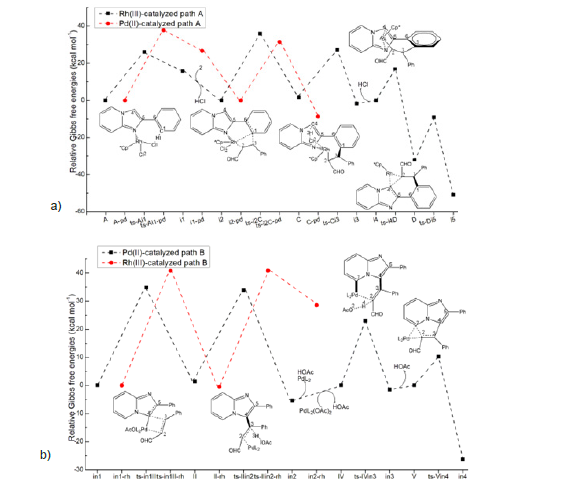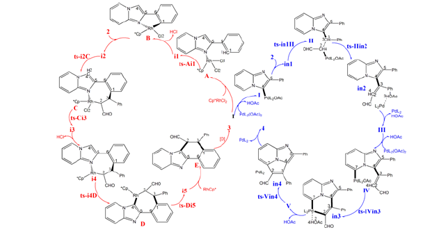 How 1,7-diarylimidazo[5,1,2-cd]indolizine-6-carbaldehyde was afforded with Pd(OAc)2 as catalyst? Why the regioselectivity was dependent on different transition-metal, wherein the regulation of changes in valence states and the effects of solvent? To solve these mechanic problems in experiment, an in-depth theoretical study was necessary for this strategy applied versatile 2-arylimidazo[1,2-a]pyridine. The Density Functional Theory (DFT) method was employed focusing on the promotion during the transformation from Rh(III) to Rh(I) and from Pd(II) to Pd(0).