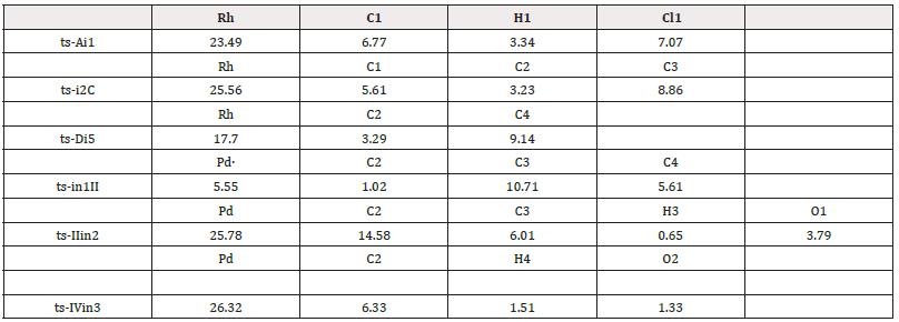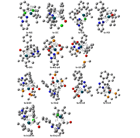 To highlight the idea of feasibility for changes in electron density and not molecular orbital interactions are responsible of the reactivity of organic molecules, quantum chemical tool Multiwfn was applied to analyze of electron density such as topological analysis of ELF, MBO results of bonding atoms and contribution of atomic orbital to HOMO of typical TSs (Table 2,3). ELF isosurface was presented by Figure 3 with green color denoting the electron localization. The marked small green part means good electron delocalization between two bonding atoms. The progress of bonding changes were fo-cused on along reaction coordinate based on a new reactivity theory named MEDT. On ELF isosurface of ts-Ai1, besides obvious connection of Rh-C1, the electron is mainly localized on H1 and Cl1 in agreement with the d electron of Rh (23.49%), bonding orbital of C1-H1 (6.77%, 3.34%) and p electron of Cl1 (7.07%) contributed to HOMO (Figure 4). This is beneficial for the abstraction of H1 by Cl1 and Rh-C1 bonding just as the results of MBO values for H1···Cl1 and Rh···C1 (0.46, 0.55). The correctness of ts-i2C is also verified by ELF analysis and HOMO composition. There is direct Rh-C2 linkage (25.56%, 3.23%) and bonding electron between C1 and C3 (5.61%, 8.86%), which is confirmed by MBO values of Rh···C2 and C1···C3 (0.59, 0.51).