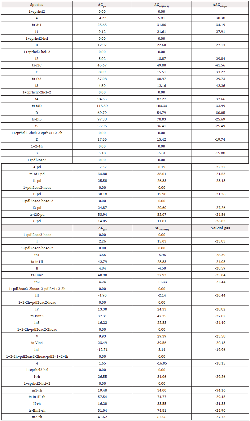 The geometry optimizations were performed at the B3LYP/BSI level with the Gaussian 09 package [26,27]. The mixed basis set of LanL2DZ for Rh, Pd and 6-31G(d) for non-metal atoms [28-32] was denoted as BSI. Different singlet and multiplet states were clarified with B3LYP and ROB3LYP approaches including Becke's three-parameter hybrid functional combined with Lee-Yang-Parr correction for correlation [33-39]. The nature of each structure was verified by performing harmonic vibrational frequency calculations. Intrinsic Reaction Coordinate (IRC) calculations were examined to confirm the right connections among key transition-states and corresponding reactants and products. Harmonic frequency calculations were carried out at the B3LYP/BSI level to gain Zero-Point Vibrational Energy (ZPVE) and thermodynamic corrections at 393 K, 413 K and 1 atm for each structure in N,N-dimethylacetamide (DMA) and N,N-dimethylformamide (DMF). The solvation-corrected free energies were obtained at the B3LYP/6-311++G(d,p) (LanL2DZ for Rh, Pd) level by using Integral Equation Formalism Polarizable Continuum Model (IEFPCM) in Truhlar’s “density” solvation model [40-42] on the B3LYP/BSI-optimized geometries.