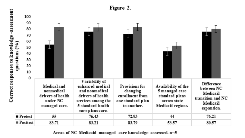 A pre-/post assessment method was used to track changes in participants knowledge and understanding of the NC Medicaid managed care reforms that were attributable to education outreach events. To this end, participants received a pretest prior to education outreach sessions and a posttest thereafter. Differences in pre- and post-assessment measurements were used to measure impact of education outreach events on the 5 knowledge areas of NC Medicaid managed care reforms that were measured in the study [29]. Data was documented only for participants who completed pretests, participated in the education outreach sessions, and completed posttests.