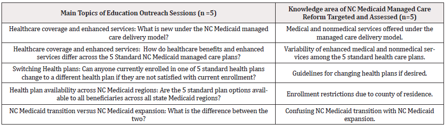 The education curriculum emphasized specific information on NC Medicaid managed care reforms that were viewed as relevant to achieving optimal health outcomes under the new delivery system. Contents included information on core differences between the new NC Medicaid managed health care delivery approach and the previous traditional fee-for-service method and core differences among the 5NC Medicaid managed care standard plans that most of the beneficiaries were enrolled in. The curriculum also highlighted differences between NC Medicaid transformation and NC Medicaid expansion Table 1. Curriculum contents were adapted from information and materials available on NCHHS website [16-18].
