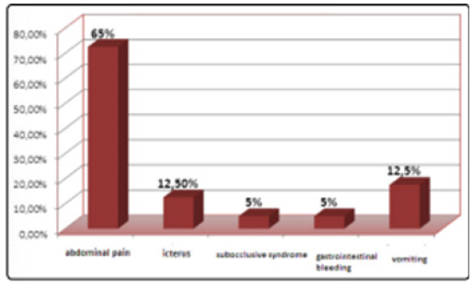 Abdominal pain was the most common symptom; it was reported by 65% of patients. -Five patients (12.5%) developed jaundice. -Sub occlusive syndrome was reported in two patients (5%). -In addition, two patients had a digestive hemorrhage (5%), the first of which was a patient’s melena from a small NET and the second had a hematemesis secondary to gastric NET. -Five patients experienced vomiting (12.50%) (Figure 3).