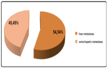 Carcinoid syndrome is made of: -Facial skin flush reported in two patients (5% of cases), -Diarrhea reported in 4 patients (10% of cases), -Carcinoid heart disease was noted in 2 patients (5% of cases). Paraclinical Data Chromogranin A was performed in 5 patients (12.5% of cases) and returned high in 4 patients: Abdominal CT was performed in 13 patients (32.5%) and was in favor of: -Small tumor process in 2 patients, Carcinoid tumor in 2 patients, Tumor liver in 3 patients, Gastric tumor in a patient, Mesenteric mass in a single case, Ileal process with retractable mesenteritis in one case, Mass of the tail of the pancreas in one case and tumor of the duodenopancreatic crossroads in a single case. All our patients underwent a Thoraco abdomino pelvic CT scan. Liver metastases were present in 12 patients, a percentage of 30%. Lymphadenopathy was present in 6 patients (15% of cases). Peritoneal metastases were present in 5 patients (12.5% of cases), and pulmonary and bone metastases were present in 2 and 1 patients respectively (5% and 2.5% of cases). Other metastatic locations have been reported in 3 patients (7.5% of cases) (Figure 4)(Table 1).