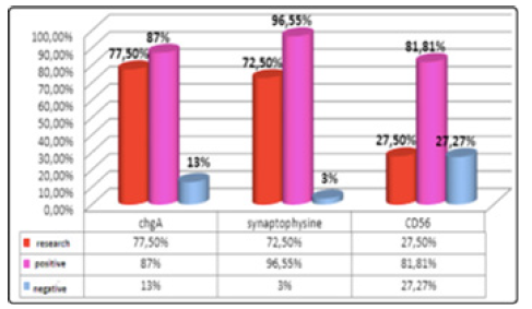 -AC Antisynaptophysin: Synaptophysin was sought in 29 patients (i.e. 72.50%). It was positive in 28 patients (96.55%) and negative in a single patient (3.4%).