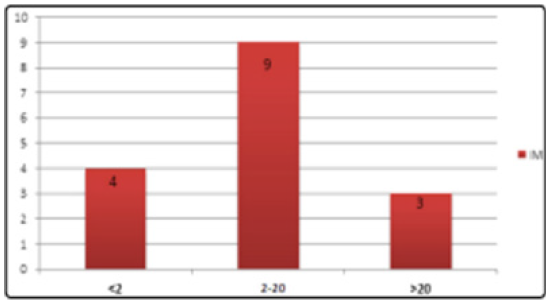 The proliferation index Ki-67 was found in the clinical records of 22 patients in our series (55% of cases). And the mitotic index was found in 16 patients (40%) (Figure 6).