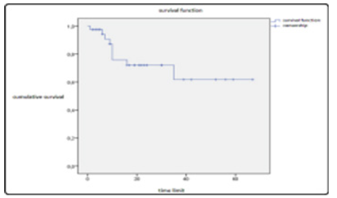 In our study, 2 patients (5%) benefited from sunitib in the first line for well-differentiated pancreatic NET and in the second line for metastatic undifferentiated liver NET. No patient received chemoembolization treatment. The evolution was marked as follows: Median survival was not achieved in our population. Overall survival at 5 years is estimated at 58% (Figure 7).