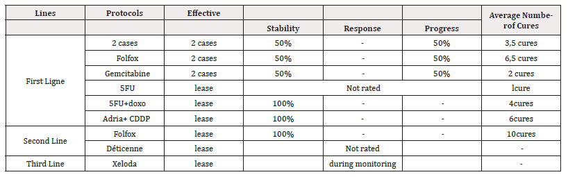 The histological grade was established in 28 patients, i.e. 70%, of whom 15% were grade 1 and 27.5% was grade 2 with 27.5% grade 3. In our series, 26 patients or 65% had stage IV,15% stage III and 20% in stage I get II. Therapeutic Data In our study, the surveillance strategy was proposed in 8 patients (20%). Of the 40 cases studied, 21 patients underwent surgery (52.50%): Primary tumor surgery in 14 cases (35%), with lymph node dissection in 8 cases (57, 14%). Among 40 cases,5 cases were treated with somatostatin analogs (12.5%). 23 patients benefited from chemotherapy in our study (57.5%): palliative in 20 patients (86.95%), concomitant with radiotherapy in 1 patient (4.34%), and adjuvant in 2 patients (8.69 %)(Table 2).