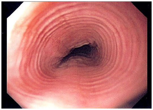 Eosinophilic esophagitis is a chronic antigen mediated immune disease of the esophagus that is characterized by symptoms related to esophageal dysfunction, and significant esophageal eosinophilia [6-8]. The first report describing EoE as a unique syndrome, characterized by solid food dysphagia and distinct from Gastroesophageal Reflux Disease (GERD) by esophageal tests, was published in 1993 [9]. Although initially thought to be a rare disease, the disorder has become increasingly diagnosed in patients presenting with dysphagia or odynophagia. After EGD and biopsy, esophageal tissues will have histologic evidence of eosinophil-predominant inflammation without identifiable secondary causes of the esophageal eosinophilia [6-8]. The primary mechanism for dysphagia in EoE is esophageal remodeling and fibrosis which is identified in over 90% of patients [10,11]. Additionally, structural alterations of the esophagus, which can form focal strictures, esophageal rings, or narrow caliber esophagus can be identified in most adults with EoE [11]. The impact of these structural alterations in EoE has been reported to decrease esophageal compliance and lead to markedly reduced esophageal distensibility in EoE patients [11,12].