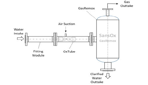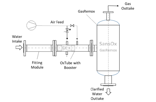 To optimize the total solution according to challenging customer needs and concerns of various water matrices a modular structure of the system is applied. The same modules are applied in various contexts and customer satisfaction with nature respect. OxTube Machine is the key module in the integrated clarification with low power consumption. The treatment doesn’t need any additional energy, but side processes like ozone and chemicals generation and feed might need power. Some solutions installed in pressurized piping might need compressed air. However, this is possible to avoid by the system design. OxTube Machine performs seamlessly all the clarification phases illustrated in Figure 3.