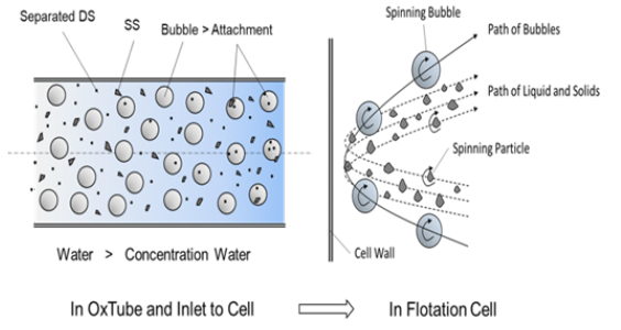 Figure 12: OxTube Machine generates bubbles and even mixture in the hermetic tube condition. Meeting probability of particles and bubbles is high, and particle attachment happens already in OxTube and the following tubes before the flotation cell [6,3,1].