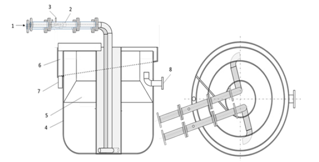 Figure 13: VoxFlot Combined Clarification, Disinfection and Flotation; 1. Water intake, 2. OxTube Water Clarification, Disinfection and Bubble Generation 3. Gas Intake, 4. Flotation Cell, 5. Bubble Trap, 6. Foam Collector, 7. Foam Outtake, 8. Clarified and Disinfected Water Outtake. The gas fed is ozone or a mixture of air and ozone. VoxFlot is presented in references [6,1,7,1].