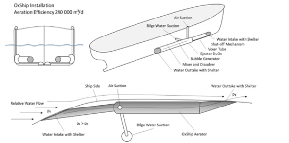 Further, the integrated water clarification can be applied in all kinds of water transport vehicles without any additional energy consumption. Kinetic energy of the vehicles in motion can be used for the treatment. Flow resistance can be kept the same or even reduced by proper design. A ship would clean sea water in depth of 4meter 240 000 cubic meters a day. Figure 17 shows an integrated ship installation.