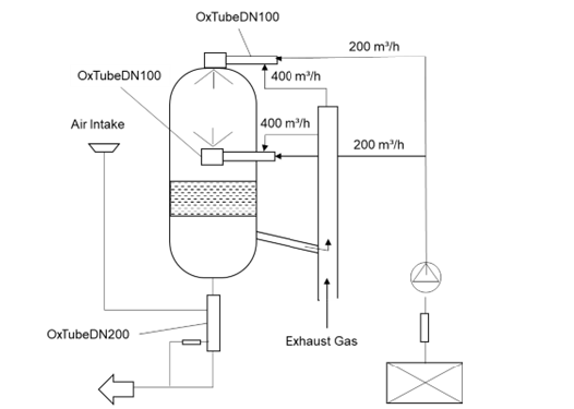 OxTube Machine can suck and mix gases in the water stream over ten times of water in volume NTP. Exhaust gases can be sucked and mixed in water of flowing tube condition and sprayed for collection and recycling. Figure 18 presents an exhaust gas washing and collection system for ships that can be engine based. The system can be scaled down to small ships and boats, and even to trucks and cars. The water can be clarified and recycled back to the washer or to the sea water clarification OxShip presented in Figure 17.