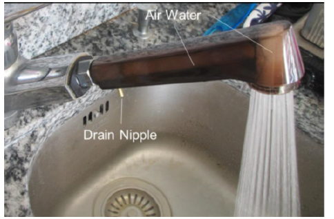 OxPro treats the water in flowing condition in its hermetic tube. It splits molecular and ionic structures, activates and separates soluble ingredients in the water, and replaces these with air gases that are sucked by vacuum in the nozzle zone. Figures 19a and 19b illustrate the four-phase treatment of OxPro. The water is cleared, and air gas dissolved in OxPro Tap of 40mm long and Shower handset. Further, a lot of air bubbles are generated and mixed in the water flow. Impacts of air gases are transferred to tissues like skin, nails and hair. and orally to metabolism by the treated water in its wet contact. Impacts of air transfer slowly in dry condition. Iron doesn’t rust in dry air but immediately in wet contact of air. The seamless OxPro Process has been verified in natural, industrial, waste as well as tap waters. OxTube Machine can be integrated easily in various devices of flowing water as shown an example in Figure 20. Examples of movable kitchen taps are presented in Figures 21a and 21b. Metal-to-metal fittings are applied meaning no seals, it can be disinfected in high temperature and its life cycle is long.