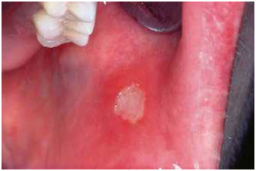 Figure 22: The painful afta (Stomatitis aphthosa) of 2cm long between gum and cheek that recovered in 14h with The Water treatment described above.