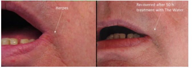 Figure 25 shows quick recovery of herpes. The treatment started after three days from the herpes identification, and it was still in expanding phase. The recovery started in one hour by rinsing, and it vanished fully in 50 hours by frequent rinsing just daytime. Many other quick recoveries of herpes and related immunity improvement have been reported.
